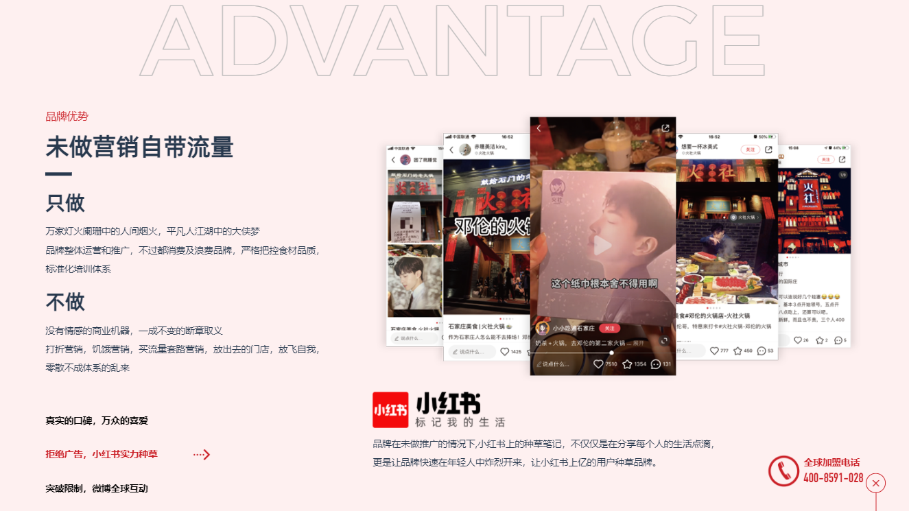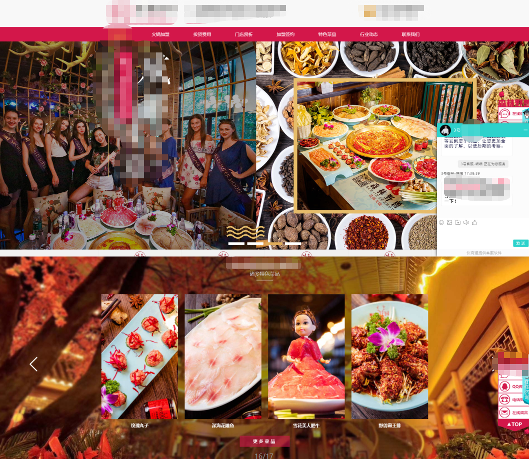 (愛(ài)蜀美極度注重用戶瀏覽網(wǎng)頁(yè)的舒適度和不被打擾性,非常反感一些營(yíng)銷工具的強(qiáng)制彈窗、反復(fù)彈出、狗皮膏藥似的占滿屏幕的四周,只保留必要的咨詢通道。所以我們只在網(wǎng)頁(yè)底部加入了一個(gè)加盟窗口,用戶可以隨時(shí)收縮/打開(kāi)窗口,在尊重用戶體驗(yàn)感的情況下,也體現(xiàn)了火社火鍋把服務(wù)放在首位的品牌理念↑)