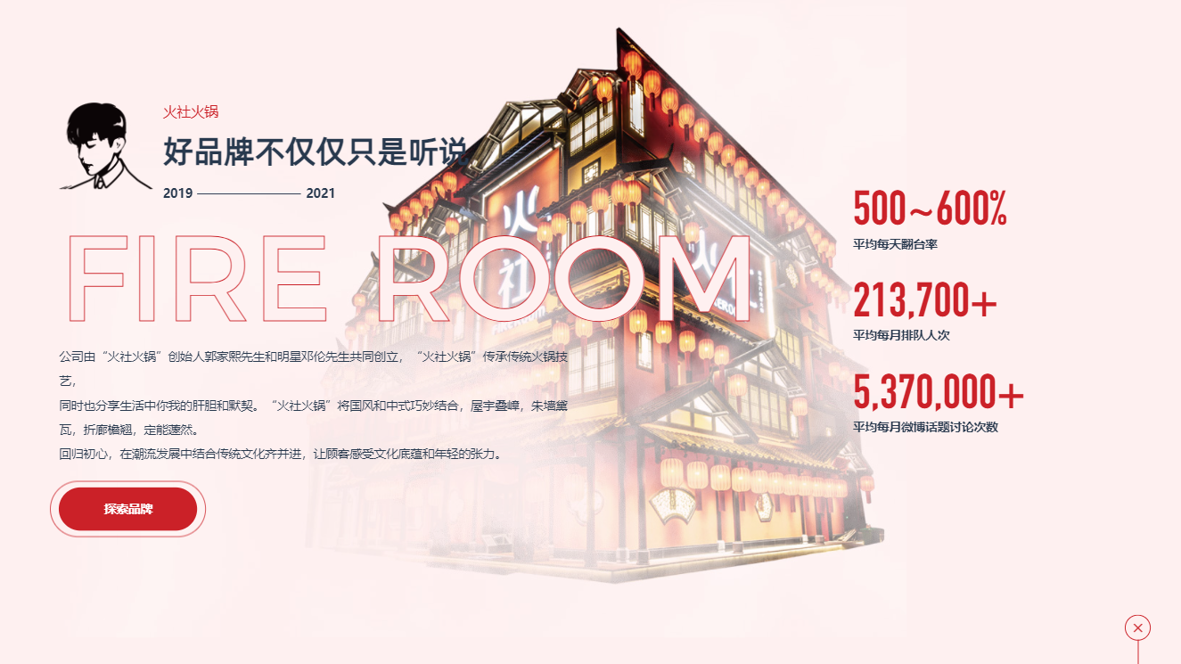 (我們將火社火鍋旗艦店的輪廓摳出來(lái),融合在整個(gè)背景里面,在不干擾用戶閱讀品牌介紹和關(guān)鍵數(shù)據(jù)的同時(shí),讓門店線下的裝修風(fēng)格和線上網(wǎng)頁(yè)達(dá)到一個(gè)契合↑)